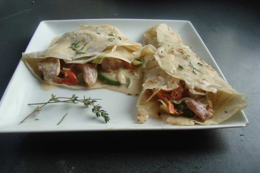 Los crepés se distinguen por su masa muy delgada, y en cuanto a su relleno se pueden realizar ilimitadas variaciones. Son muy versátiles, ya que pueden ser tanto dulces como salados, pero su resultado siempre es una delicia. Son originarios de Francia, y desde su primigenia eran preparados en tiempo de escasez, de modo que se cree que este delicioso plato se remonta a la época del Imperio Romano. Hoy prepararemos crepés de pollo y verduras, un plato que mezcla sabores, colores y aromas. Un resultado irresistible, así es que anímate y ¡a cocinar! Ingredientes (5 porciones)