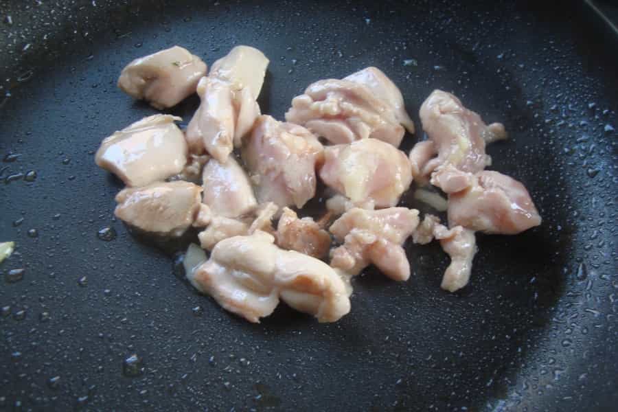 Preparar el relleno: cortar el pollo en tiras, condimentarlo con sal. En un sartén con aceite caliente sellar el pollo.