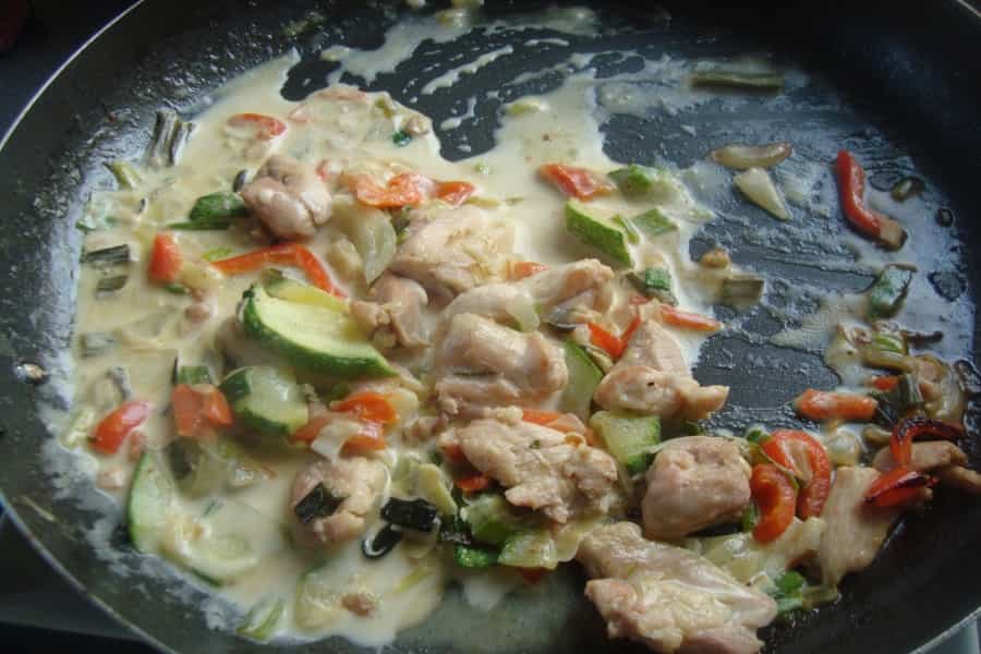 Una vez que esté dorado por ambos lados, agregar las verduras picadas en tiras finas, sofreír por 5 minutos, revolviendo suavemente, incorporar la crema, rectificar sazón.