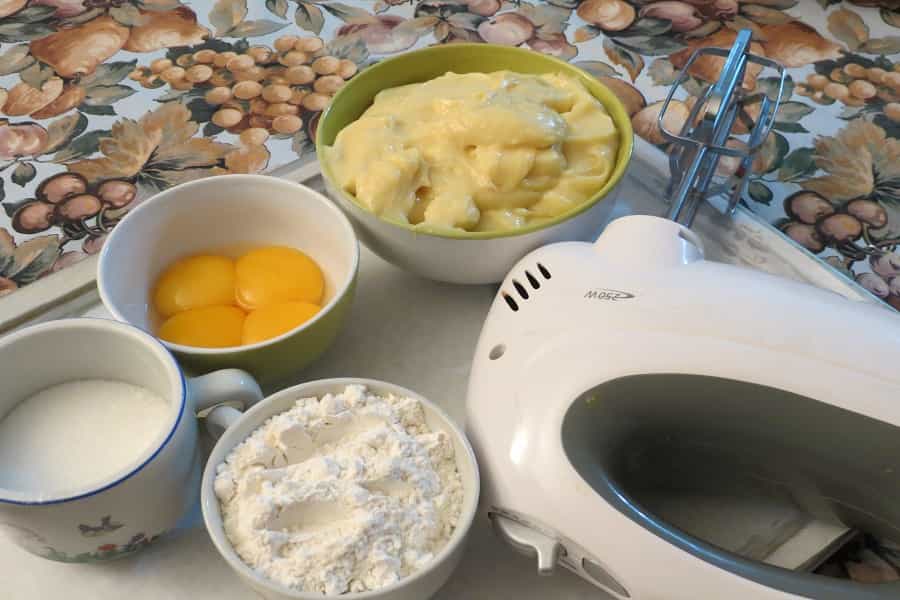 Preparación: Lo primero que debes hacer es separar la clara de las amarillas de los huevos. Colocar las claras de huevo en una taza mediana y batir a punto de nieve, luego agregar la taza completa de azúcar y continuar batiendo. Después se colocan las amarillas de los huevos. Detener la batidora y agregar la harina en forma envolvente (de manera manual y haciendo óvalos) con el propósito de que se mantenga la mezcla con aire. Colocar el papel mantequilla en la bandeja y expandir la mezcla. Llevar al horno (precalentado con 150 grados) durante 20 minutos.