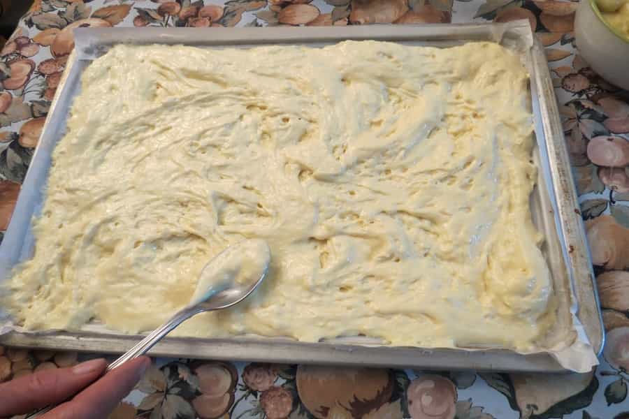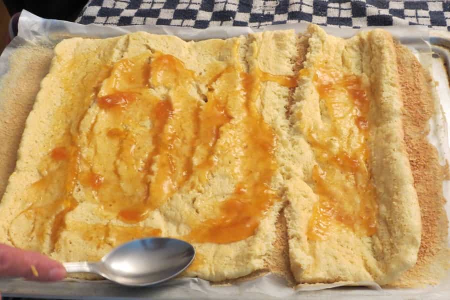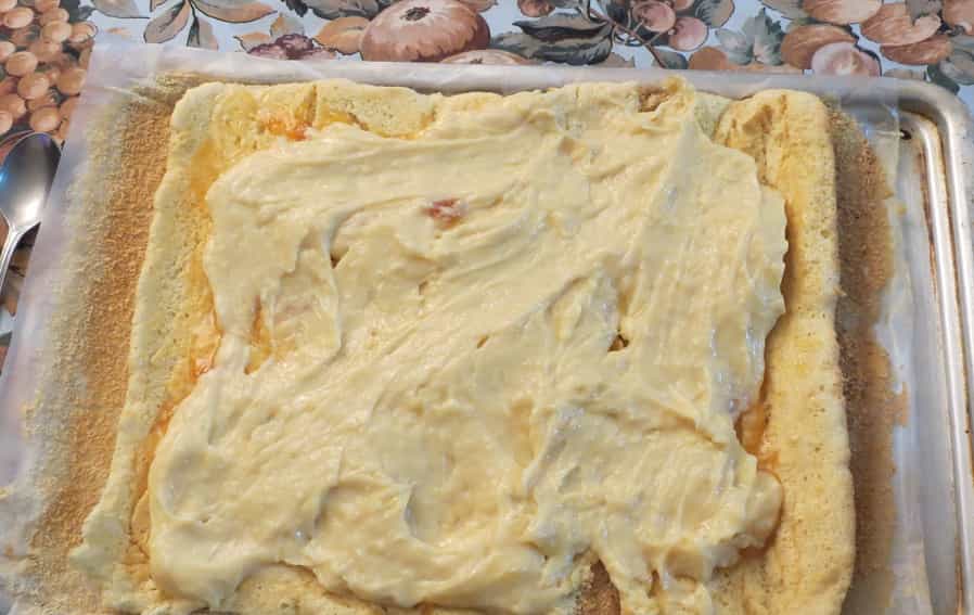 Se deja reposar enrrollado con papel, hasta que enfríe. Abrir y despegar el papel, expandir en la bandeja nuevamente y rellenar, en este caso quise utilizar un poco de mermelada de durazno y luego la crema pastelera.