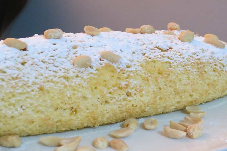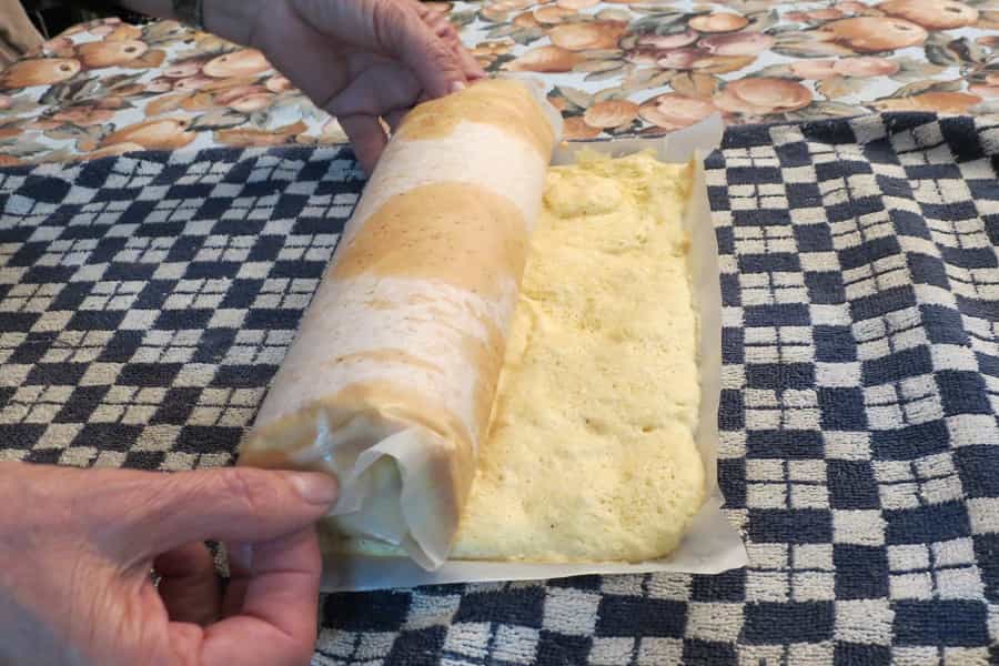 Al sacar la masa del horno, se debe enrrollar inmediatamente junto al papel estando caliente.