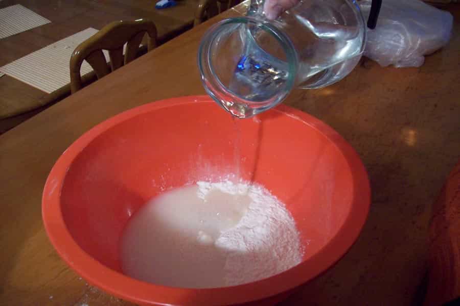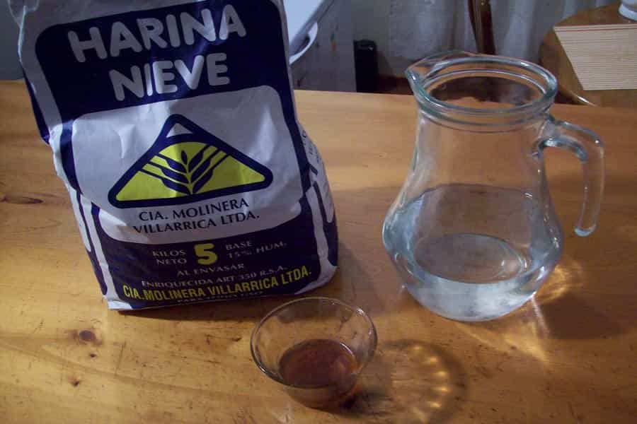 200 mL. de agua fría 3 tazas de harina 1 L. de agua hervida 100 gr. de miel, mermelada o manjar Preparación: En un bol mezcla las 3 tazas de harina con los 200 ml. de agua fría hasta que quede una masa.