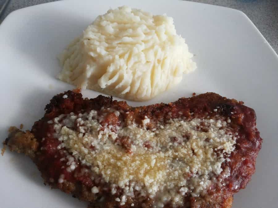 Cuando ya están listos. Le agregas la cucharada de pasta de tomate y empolvoreas el queso parmesano de acuerdo al gusto de cada quien Y se tapa en la misma sartén con el fuego bien bajo, con la idea que se derrita el queso, si lo deseas lo puedes meter al horno por unos 5 minutos. Importante es servir bien caliente, puede ser acompañado con arroz blanco o puré de papas.
