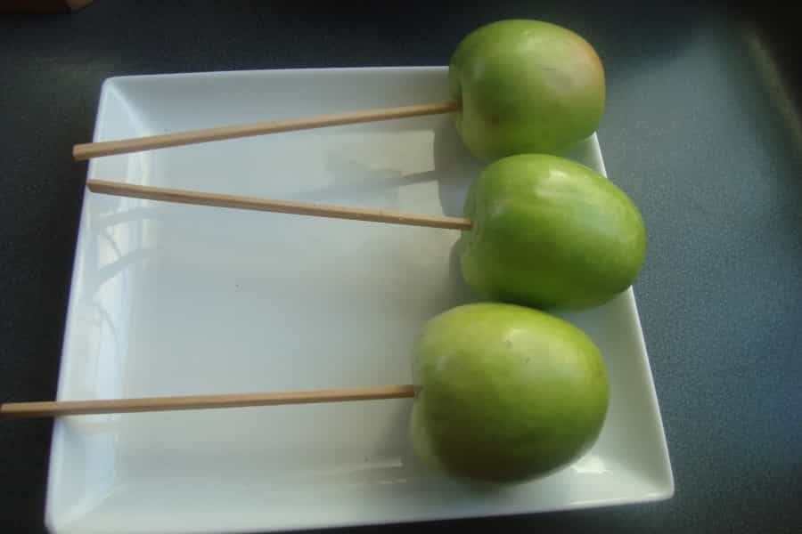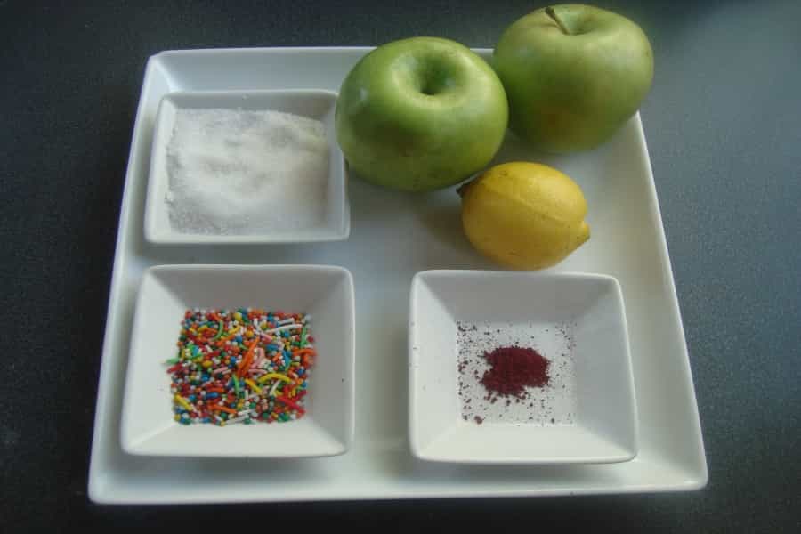 -3 manzanas -250 gramos de azúcar -3 cucharadas de agua -1 cucharadita de jugo de limón -Colorante rojo -Mostacillas, virutas de chocolate, coco rallado Preparación Lavar las manzanas y secarlas (debes quedar bien secas). Poner a las manzanas un palito de madera (un palo de helado o un palo de sushi), enterrarlo en el centro de la manzana, tratando que quede firme.