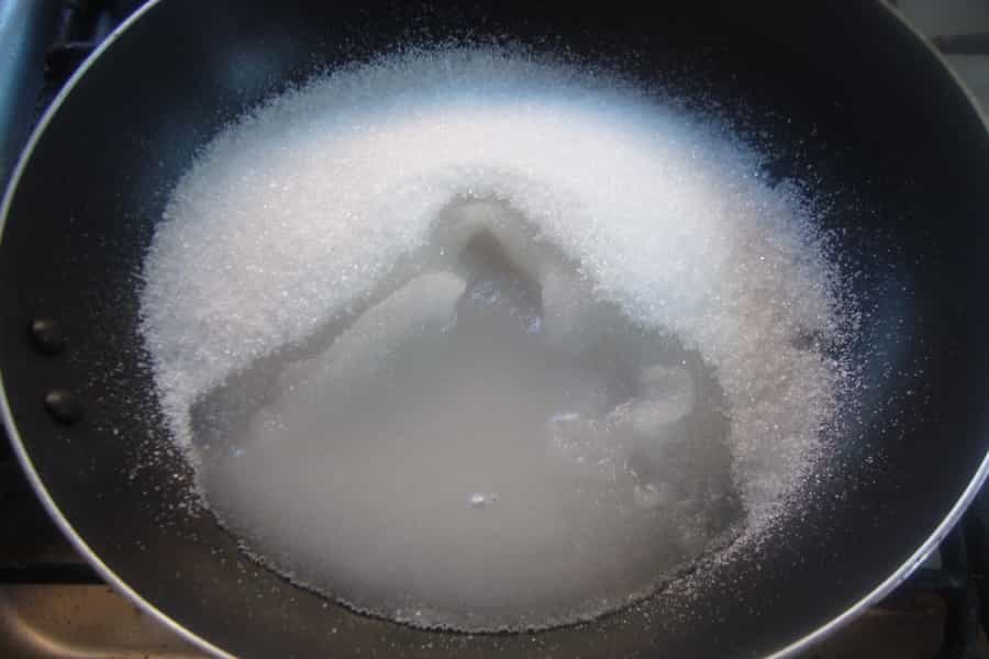 En una olla o un sartén poner azúcar, agua, jugo de limón, llevar a fuego y cocinar hasta que se forme un caramelo de color café claro.