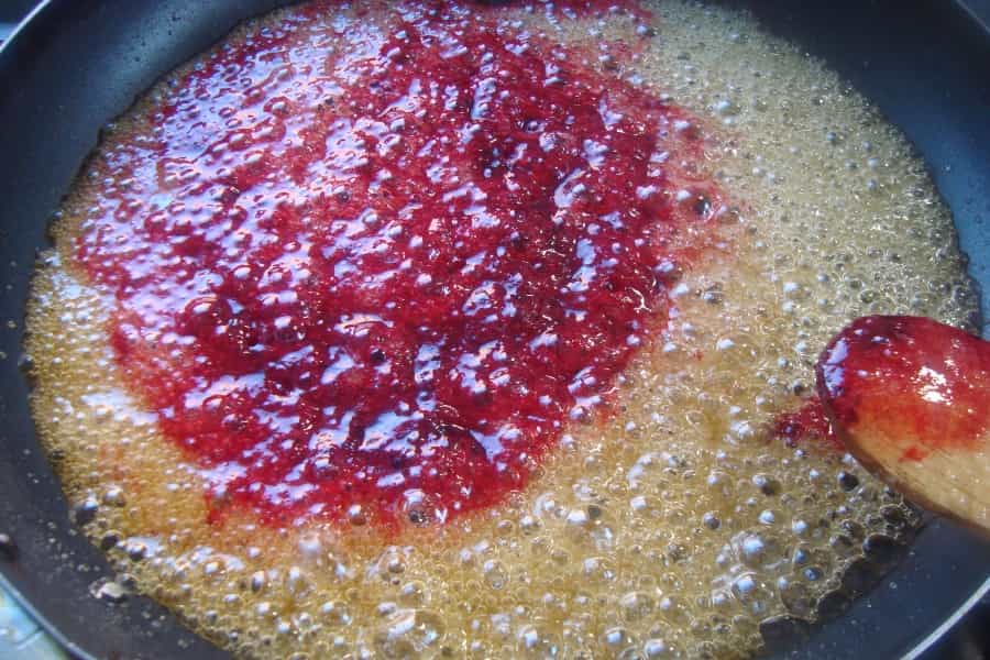 Retirar la olla del fuego, agregar colorante rojo hasta obtener en color rojo intenso, mezclar. (Si el colorante es líquido agregar unas 6 gotas y si es en polvo 1/4 cucharadita).