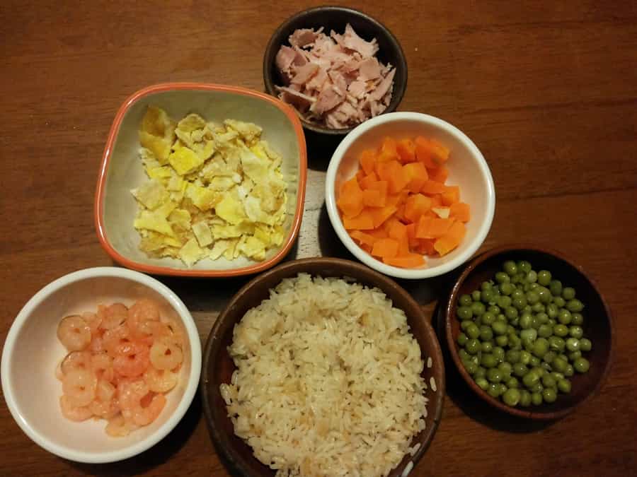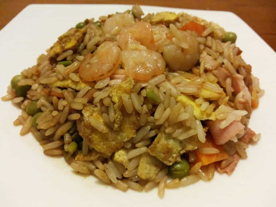 Uno de mis gustos es ir al restaurant chino y siempre pedir de acompañante arroz cantonés. Tanto me gusta que aprendí a prepararlo y no tiene nada que envidiarle al restaurante de la esquina. Así les presento este delicioso plato, que sirve para acompañar carnes y pollo. Los ingredientes necesarios para 4 personas son: 1 taza de arroz blanco 1 taza de zanahorias picadas en cuadritos pequeños 1/2 taza de arvejas verdes ½ taza de camarones cocidos (pueden ser hervidos o dorados) 2 lonjas de jamón de pierna picada en cuadritos 1 tortilla de un huevo picada en cuadritos