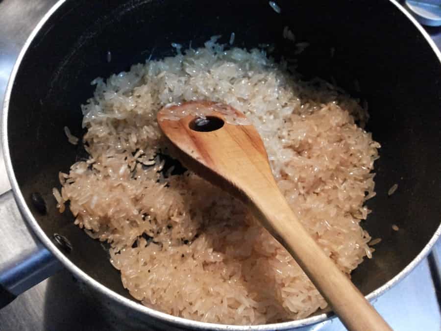 Lo primero es hacer el arroz, para lo cual en la olla colocamos un chorrito de aceite y colocamos la taza de arroz, vamos revolviendo con cuidado que no se pegue ni se queme, esto con la idea que el arroz se doré un poco. Luego agregamos las 2 tazas de agua y una pizca de sal. Dejamos haciendo el arroz como de costumbre, una vez que esté listo se retira del fuego.