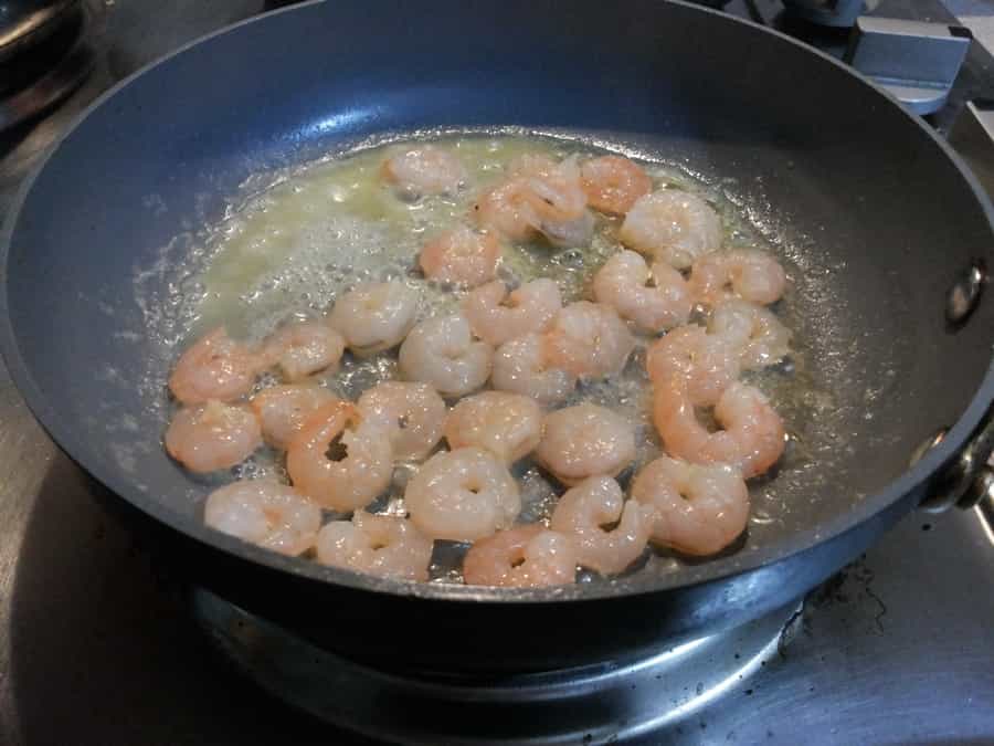 En una sartén ponemos un chorrito de aceite y salteamos los camarones, también pueden ser pasados por agua.