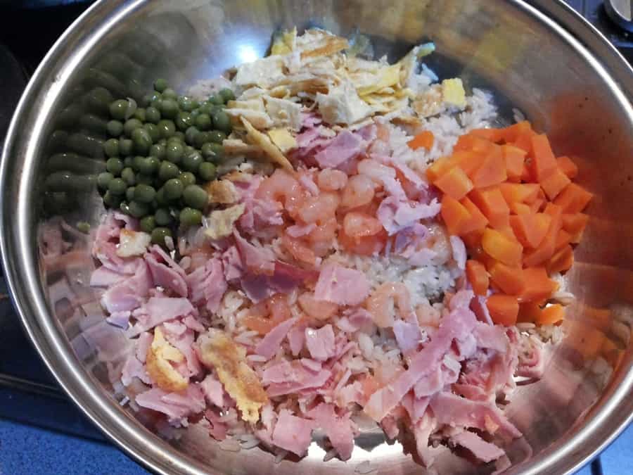 En una sartén grandecita colocamos el arroz y todos los ingredientes y los unimos. Si le gusta le puede poner un chorrito de salsa de soya o dejarla para que los comensales le agreguen al gusto.