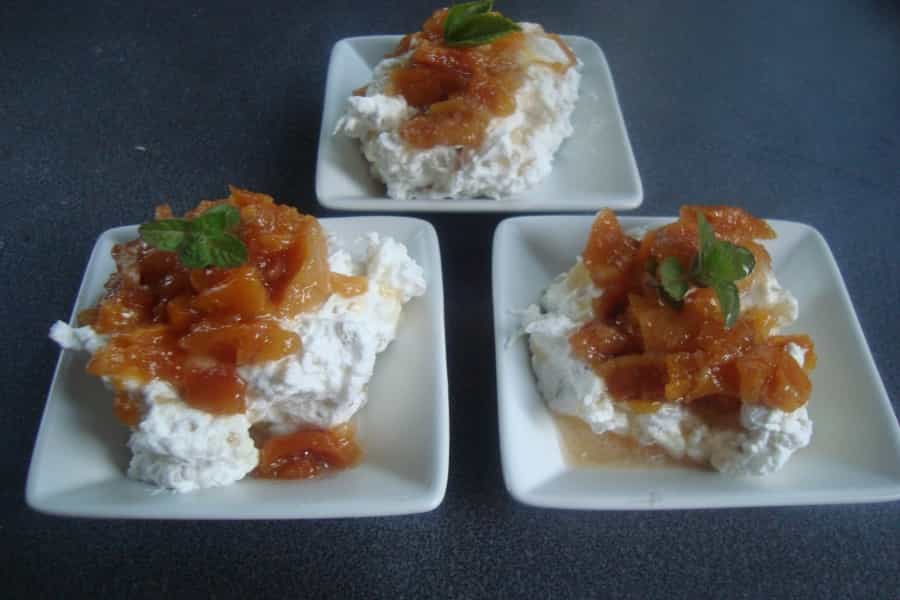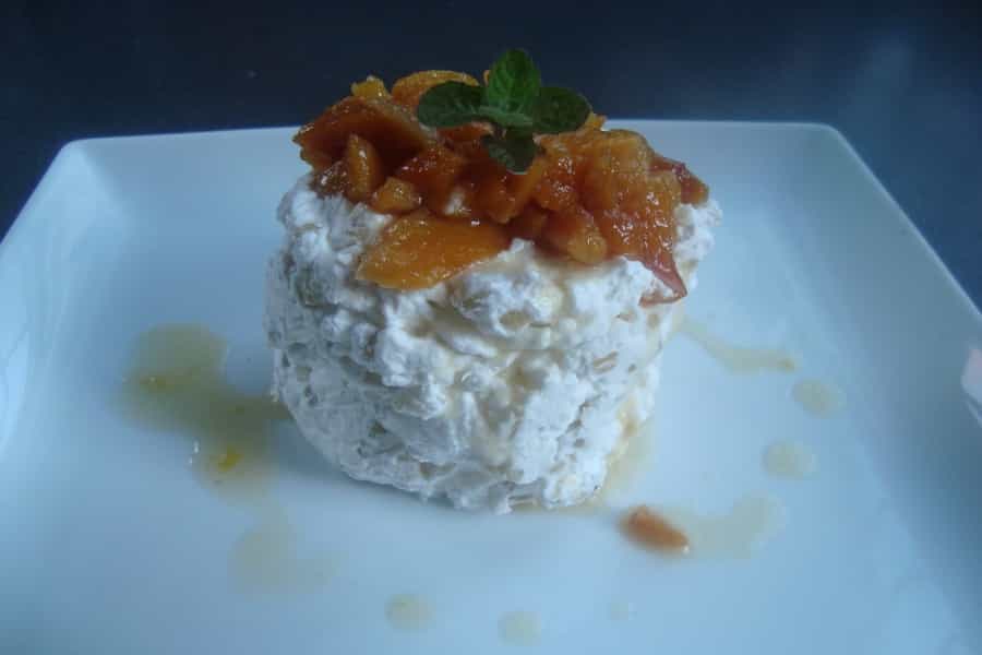 Otra forma de servir es colocar 1 a 2 cucharadas de mousse en un plato o pocillo y sobre el la pulpa de huesillos. Refrigerar y servir.