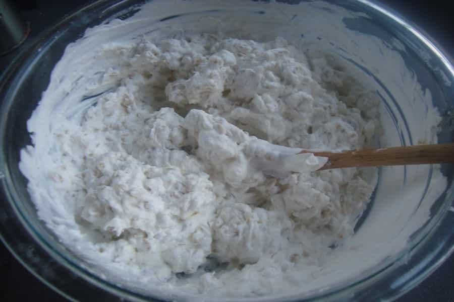 Formar el mousse, para esto mezclar el mote cocido, la crema batida y la gelatina sin sabor disuelta, revolver suavemente hasta integrar totalmente.