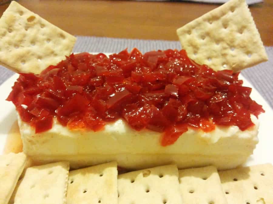 Este es un delicioso dip que pueden preparar para agasajar a sus invitados en una reunión. La combinación del queso crema y el dulce de la mermelada de pimentón los dejará con ganas de más. Sólo tres ingredientes para hacer esta receta: 1 queso crema de 250gms ½ pimentón rojo cortado en cuadritos 1/3 de taza de azúcar