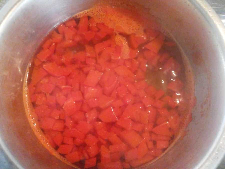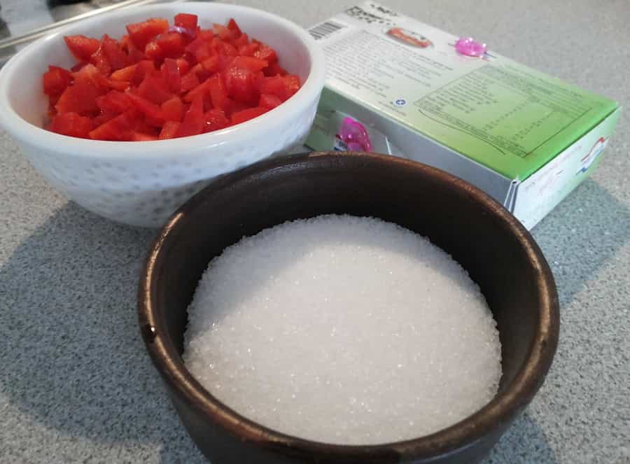 Preparación: Para la mermelada: Se coloca en una olla pequeña 2 tazas de agua, cuándo ésta comience a hervir se agrega el azúcar y el pimentón picadito. Se baja un poco el fuego y se dejar hervir hasta que se reduzca y quede con la consistencia de mermelada.