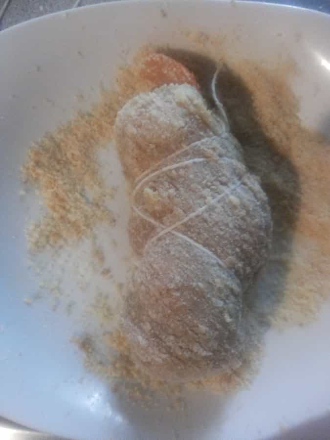 Cerramos la pechuga y la amarramos con la pita o cordón de algodón (es importante que no sea con color, ya que esas manchan). En un envase aparte mesclamos el pan molido con el queso parmesano. Pasamos la pechuga por el huevo batido y posteriormente apanamos en la mescla de queso y pan.