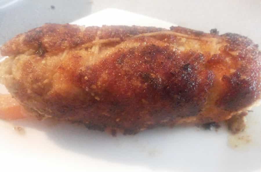 En un sartén bien caliente doramos la pechuga dándole vuelta constantemente para que no se queme, ya que el queso tiende a quemarse rápidamente. Bajamos el fuego al mínimo y la dejamos tapada unos 10 minutos más, para que se cocine bien por dentro y la cebolla y el tomate suelten sus jugos.