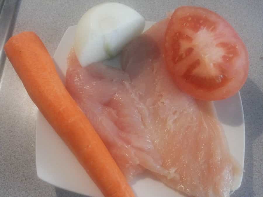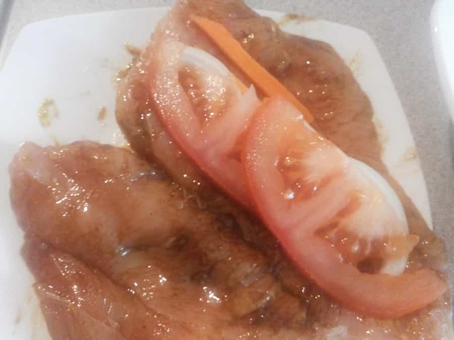Preparación: Lo primero es abrir la pechuga de pollo tipo mariposa. Le agregamos sal al gusto y la salsa inglesa (opcional), le colocamos la cebolla, la rueda de tomate picada en 2 y los bastones de zanahoria.