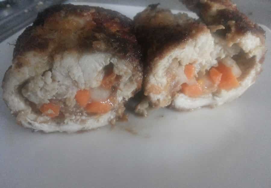 Pechugas de pollo rellenas con vegetales Cuando apenas hay tiempo para cocinar pero queremos hacer algo diferente las pechugas de pollo rellenas con vegetales son un plato realmente fácil y rápido para hacer. Además el apanado especial de pan molido y queso parmesano hará que esté crujiente por fuera y gustoso por dentro. Para una pechuga de pollo necesitarás: 1 pechuga de pollo 1 rueda de tomate grande Una rueda de cebolla 2 o 3 bastones de zanahoria Sal y un poco de salsa inglesa (opcional) 30cmts de cordón o pita de algodón (para amarrar la pechuga)