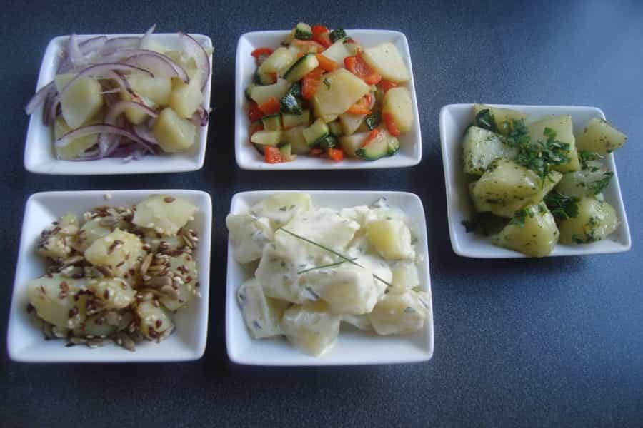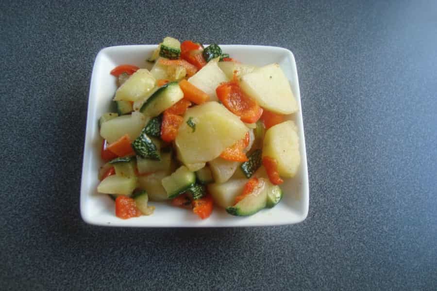 -1 Kilo de papas cocidas -½ pimentón verde -½ pimentón rojo -½ cebolla -½ zapallo italiano -1 diente de ajo -Sal - Merquén -Aceite de oliva Preparación En un sartén con aceite caliente sofreír por 5 minutos los pimentónes, cebolla, ajo y zapallo italiano, todo cortado en cubos pequeños, agregar las papas cocidas, peladas y cortadas en cuadrados, sazonar son sal y merquén a gusto, cocinar por 2 minutos y servir. 2) Papas con salsa de yogurt y ciboulette Ingredientes (4 porciones)
