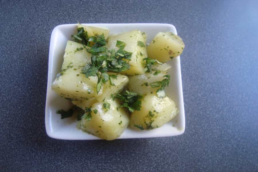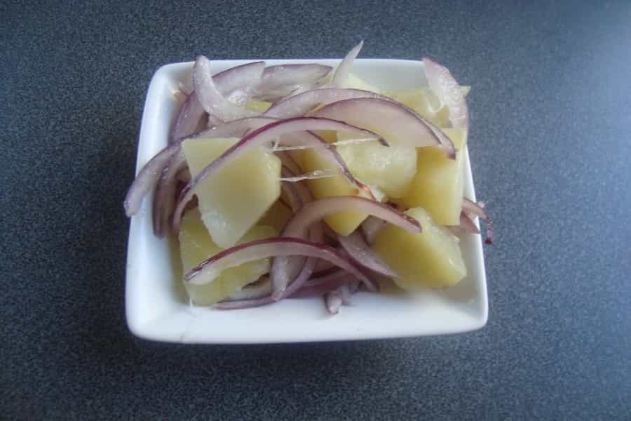 Ingredientes (4 porciones) -1 kilo de papas cocidas -2 cebollas moradas -1 limon -Sal – Pimienta -Aceite de oliva Preparación Cortar la cebolla morada en pluma, lavarla bajo el agua por 2 minutos, escurrir y reservar. En una fuente disponer las papas cocidas, peladas y partidas, agregar el jugo de limón, aceite de oliva y salpimentar, añadir la cebolla morada y mezclar. Refrigerar por 15 minutos antes de servir. 4) Papas con mayonesa verde