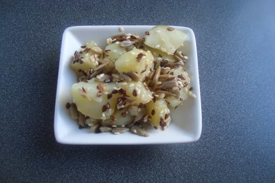 -1 kilo de papas cocidas -4 cucharadas de semillas de girasol -3 cucharadas de semillas de sésamo -2 cucharadas de semillas de linaza -Jugo de 2 limones -¼ taza de aceite de oliva -Sal - Pimienta Preparación En un sartén sin aceite poner las semillas y tostarlas, moverlas constantemente para que no se quemen. En un recipiente mezclar el jugo de limón, aceite de oliva, las semillas tostadas (frías), salpimentar a gusto. En un recipiente mezclar las papas cocidas y picadas con el aderezo de semillas, rectificar sazón y servir. Lo bueno de las papas es que no sólo son deliciosas, sino que también muy versátiles, ya que puedes prepararlas de mil formas y obteniendo sabores únicos. Elige la receta que más te guste e intégralas en tu asado que, sin duda, dará qué hablar.