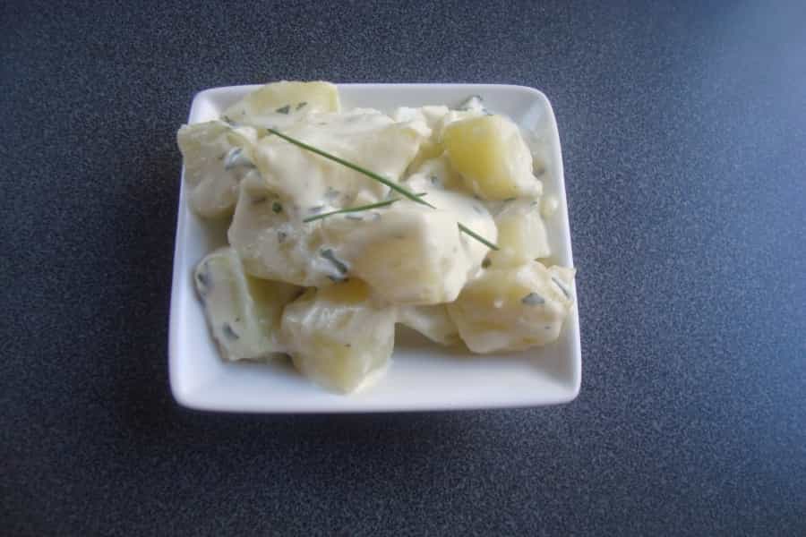 -1 kilo de papas cocidas -1 diente de ajo -1 yogurt natural -100 gramos de crema -4 cucharadas de ciboulette picado -1 cucharada de jugo de limón -Sal - Pimienta -Aceite de oliva Preparación En un pocillo mezclar el yogurt natural, la crema, el ciboulette y el diente de ajo picado fino, sazonar con sal y pimienta a gusto, añadir el jugo de limón y 3 cucharadas de aceite de oliva, revolver y reservar. En una fuente mezclar las papas cocidas, peladas y partidas con la salsa de yogurt y ciboulette , rectificar la sazón y servir. 3) Papas con cebolla morada