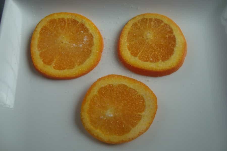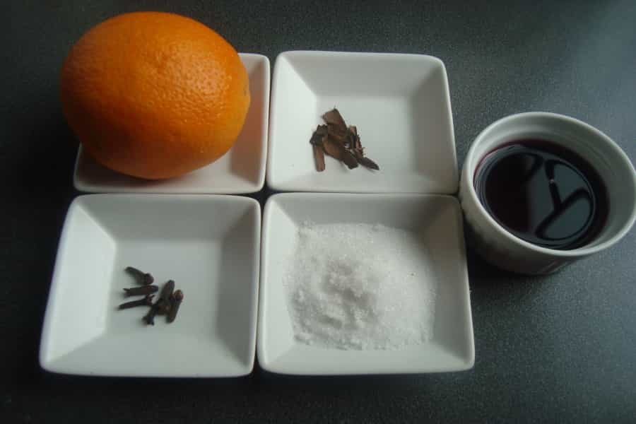 -1 botella de vino tinto -1/3 taza de jugo de naranja -2 naranjas -2 palos de canela -4 clavos de olor -½ taza de azúcar -4 cucharadas de azúcar Preparación Partir la naranja en rodajas finas, eliminar las pepas, espolvorear con 4 cucharadas de azúcar, dejarlas macerar por 10 minutos.