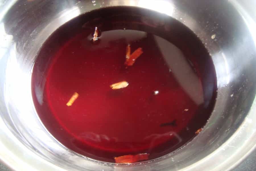En una olla mezclar el vino tinto, el jugo de naranja (colado y sin pepas), los clavos de olor, la canela y el azúcar. Revolver hasta integrar completamente.