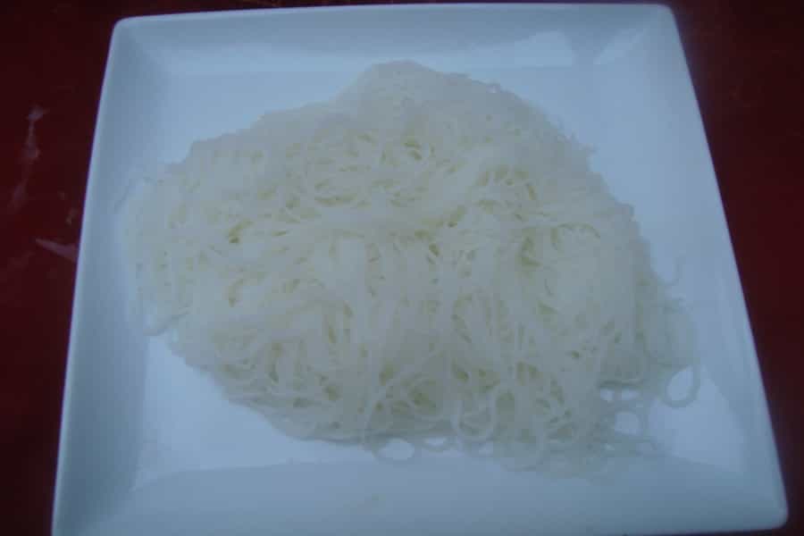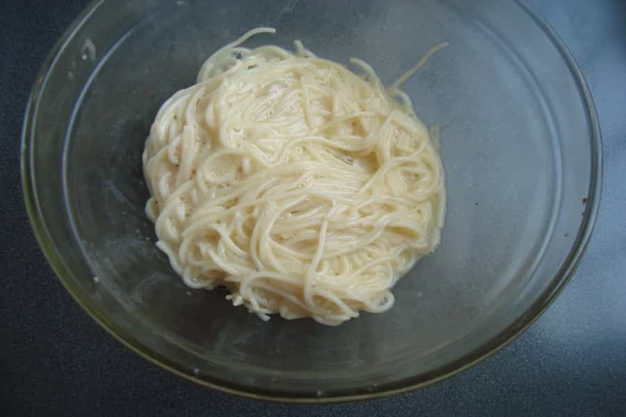 En un recipiente batir los huevos, añadir los fideos, mezclar suavemente.