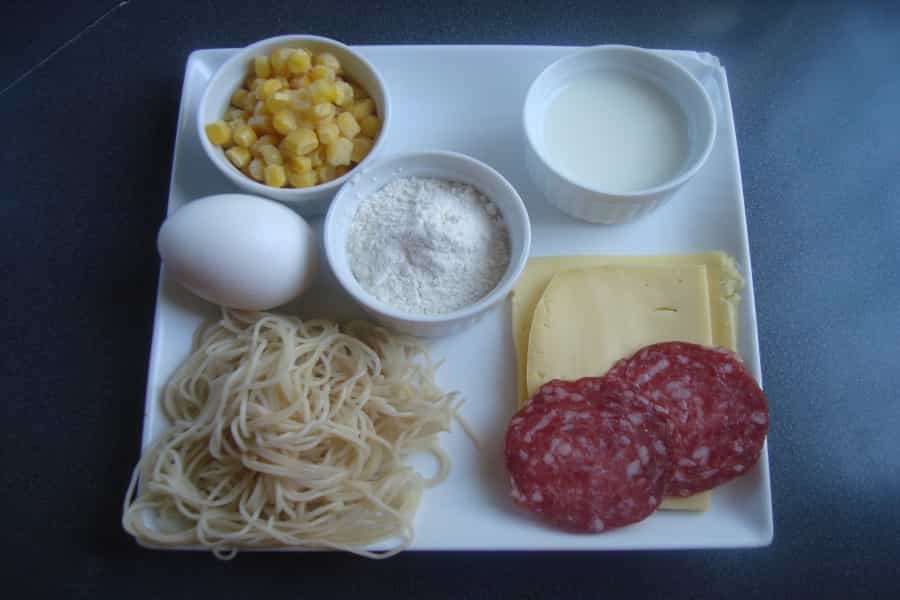 -400 gramos de tallarines -2 huevos -2 cucharadas de harina sin polvos de hornear -250 centimetros cubicos (cc) de leche -1 ½ cucharada de maicena -250 gramos de choclo en grano cocido -150 gramos de salame -250 gramos de queso para derretir -Sal – Merquén -1 Cucharadita de orégano -Aceite de oliva Preparación En una olla con abundante agua y sal cocer los tallarines por 15 minutos, hasta que estén blandos. Escurrir y reservar.