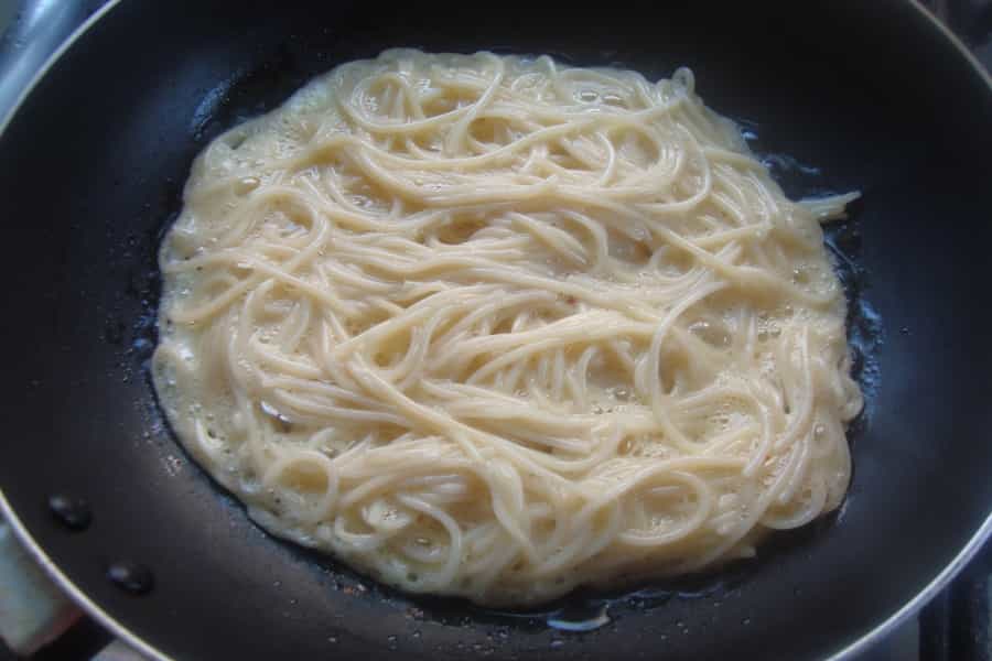 En una sartén con 2 cucharadas de aceite caliente, verter la mezcla de fideos y huevo, aplastarlos bien, mover para que no se peguen, dar vuelta y cocinar por el otro lado.