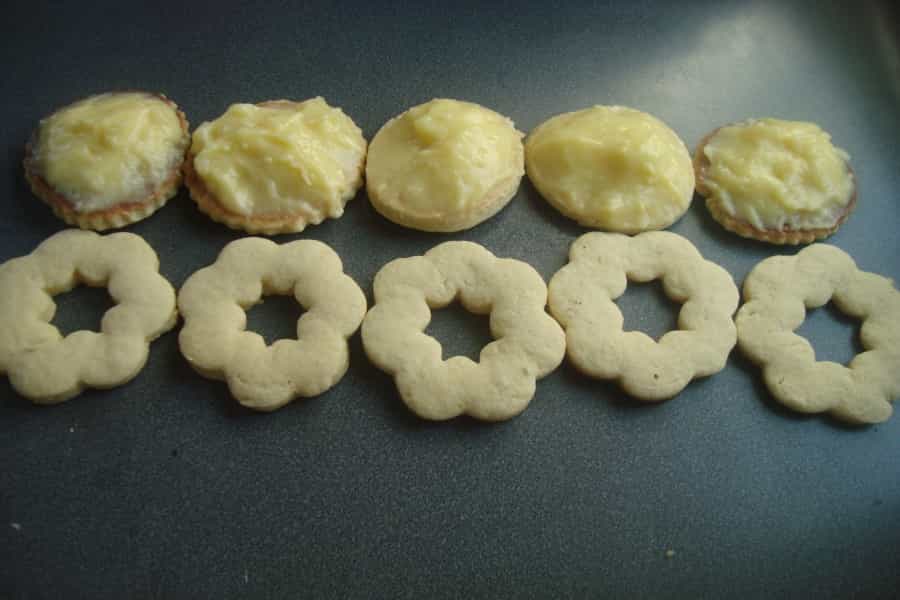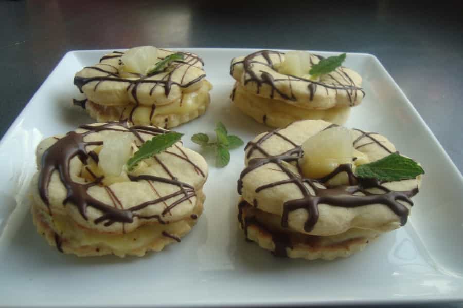 Rellenar las masas horneadas con la crema de piña, tapar con otra masa. Espolvorear azúcar flor o bañar con chocolate.