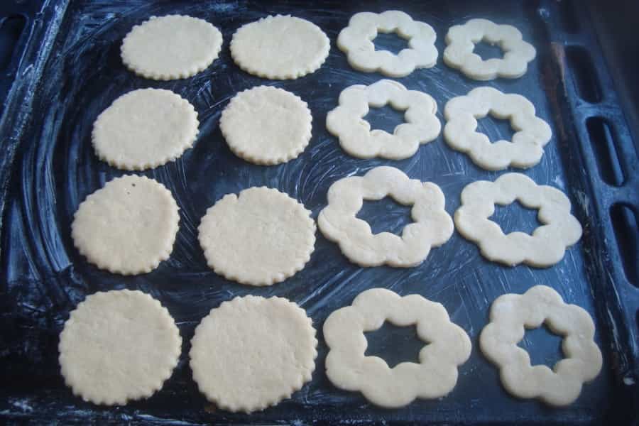 En una mesa enharinada con ayuda de un uslero estirar la masa y cortar círculos. Colocar la masa de los alfajores en una lata de horno enmantequillado. Hornear por 10 a 15 minutos hasta que las masas estén levemente doradas.