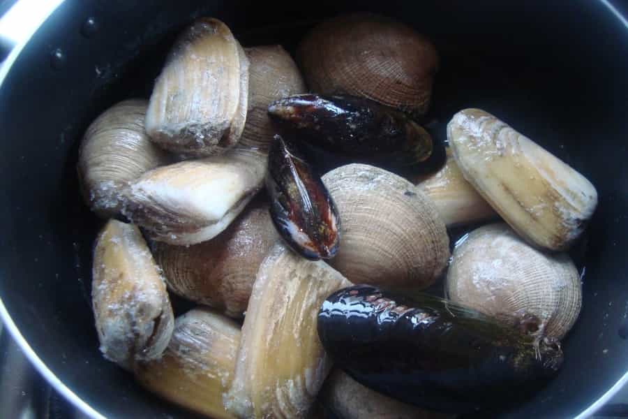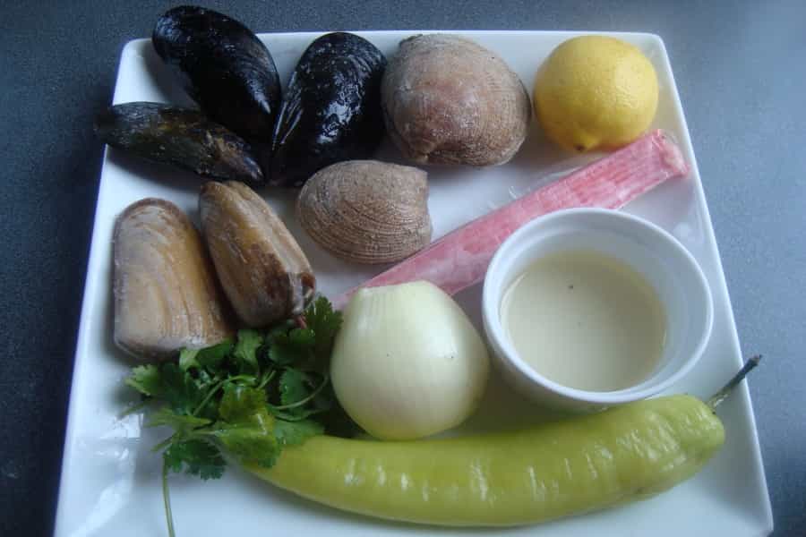 -1 kilo de choritos -1 kilo de almejas -1 kilo de machas -1 cebolla -1 diente de ajo -1 ají verde -Kanikama -Perejil fresco -1 copa de vino blanco -Sal - Pimienta -Aceite de oliva Preparación Lavar los mariscos, en una olla con agua cocinar a fuego medio tapados por 10 minutos los choritos, las machas y las almejas (con conchas).