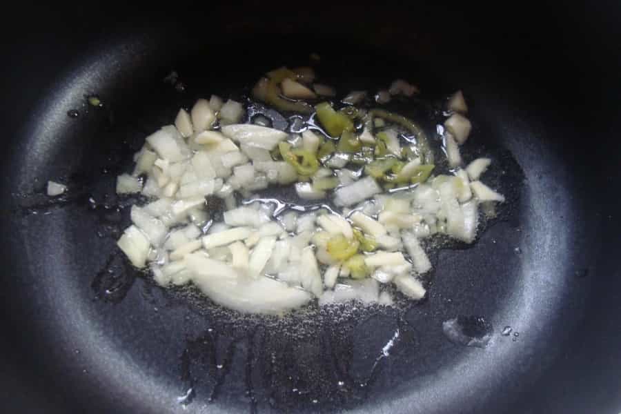 Transcurrido el tiempo sacar los mariscos de sus conchas y limpiarlos. Reservar algunos mariscos con sus conchas. En una olla con 3 cucharadas de aceite de oliva sofreír por 2 minutos la cebolla cortada en cuadritos, agregar el diente de ajo cortado y el ají picado, salpimentar a gusto.