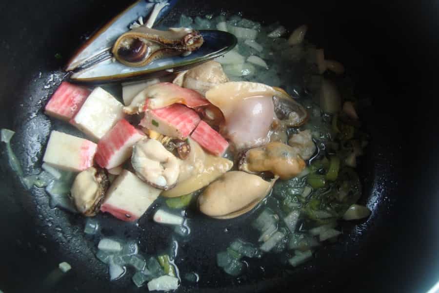 Cuando este todo sofrito agregar los mariscos sin sus conchas y los reservados con conchas, cubrir con agua, agregar el vino blanco.