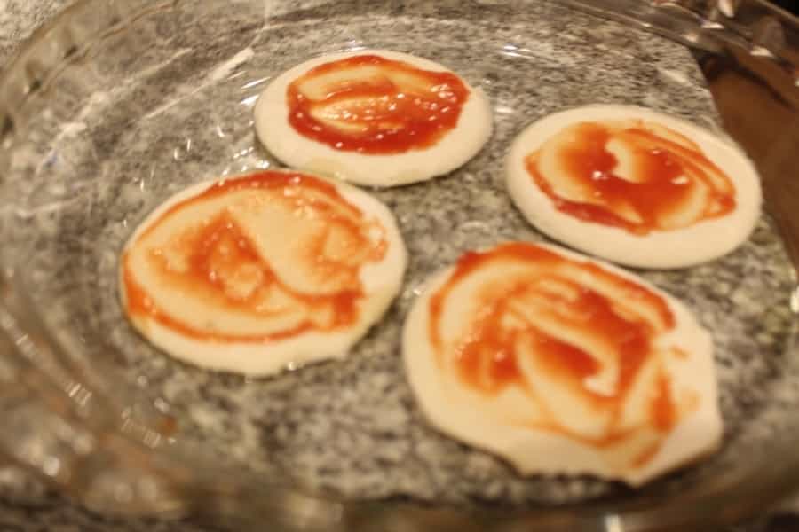 4. Poner la masa en una fuente y taparla con un paño. Dejarla levar en un lugar cálido por 30-45 minutos. 5. Cuando haya pasado el tiempo, enharinar una superficie y con uslero estirar la masa hasta que quede de un centímetro de grosor. Con una taza dada vuelta cortar círculos de masa. 6. Prender el horno y dejarlo calentando al máximo. Esparcir una cucharada de salsa en cada pizzeta y disponerlas en una fuente aceitada. Meterlas al horno por 5 minutos. En este tiempo la masa tiene que endurecerse un poco.