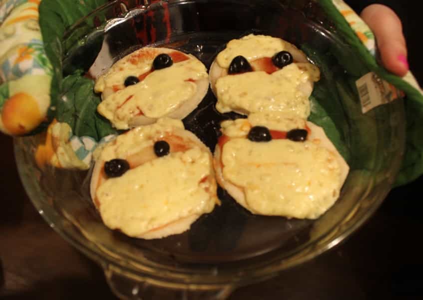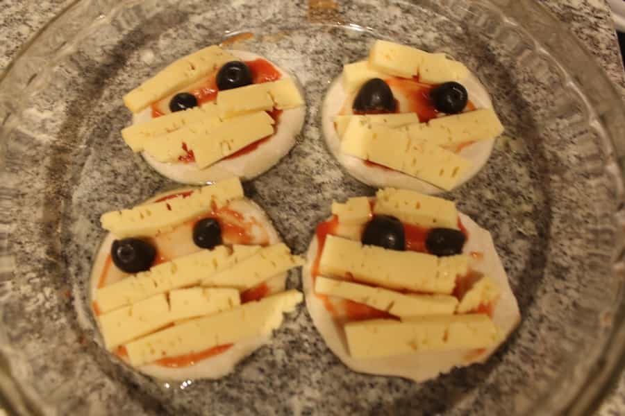 7. Sacarlas y disponer las tiritas de queso sobre las pizzetas y dos rodajas de aceitunas como ojos.
