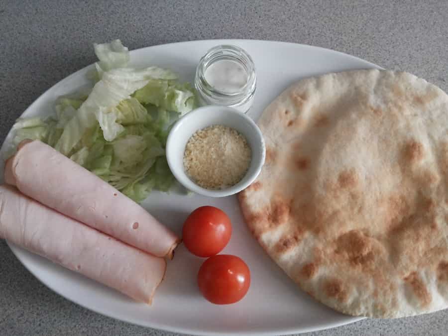 Preparación: Cortamos el pan pita por la mitad y lo abrimos. Allí colocamos la lechuga, el jamón (una lámina para cada lado), los tomaticos cherry picados en rodajas. Y el pimentón asado previamente. El pimentón es súper sencillo de asar. Debes colocarlo sobre una plancha y taparlo, ir dándole vuelta hasta que la piel se vaya poniendo negra y el pimentón se ablande. Una vez hecho esto, mantenlo tapado hasta que se enfríe y allí es el momento de quitarle toda la piel con total facilidad. No intentes quitarle la piel aun estando caliente porque te quemarás y es muy difícil.