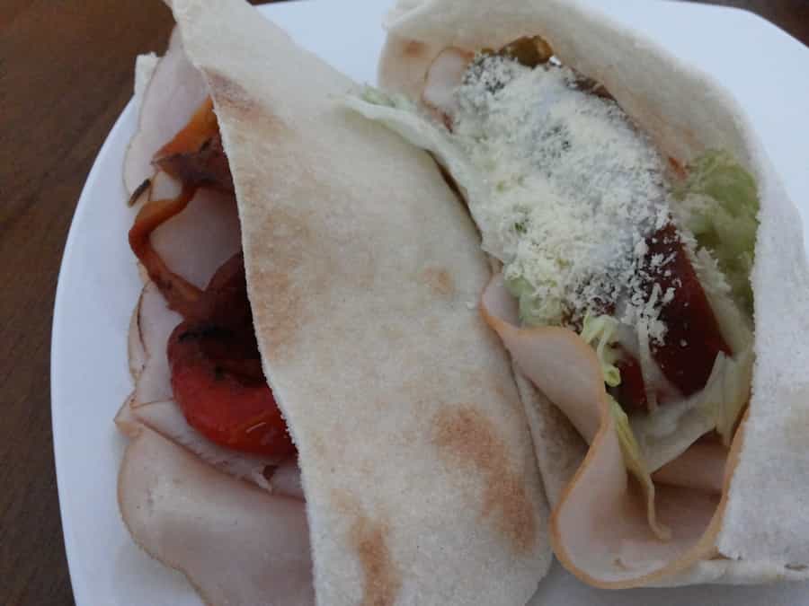 Ideal para llevar a la oficina, o para la lonchera. Es un sándwich lleno de color y light. Además que con el ingrediente estrella, pimentón asado, lo disfrutarás al máximo. Necesitas para un sándwich: Un pan pita 1 taza de lechuga picada 2 tomates cherry (opcional) 2 láminas de jamón de pavo 2 cucharaditas de queso parmesano 2 cucharadas de aliño cesar pre hecho (opcional)