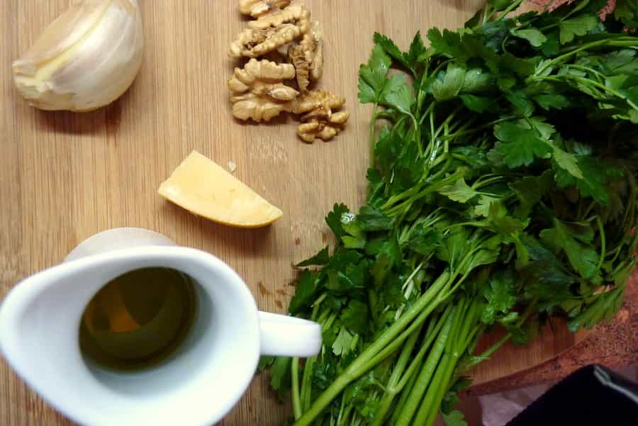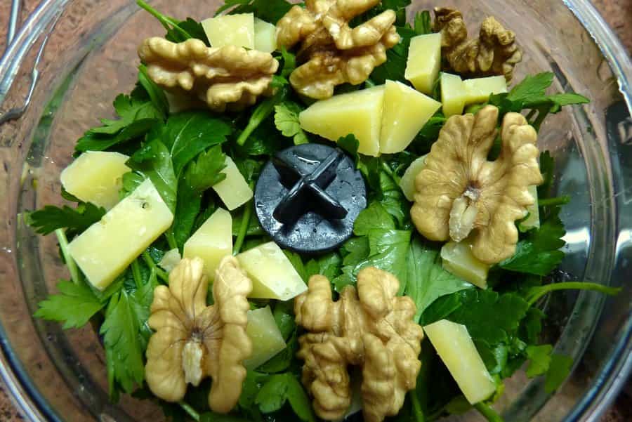 En un procesador de alimentos, introduce el perejil, ajo salteado junto con el aceite, nueces, queso y aliños. Si no tienes espacio para poner todos los ingredientes juntos desde el comienzo no te preocupes, pues el volumen irá disminuyendo a medida que los ingredientes se muelan.