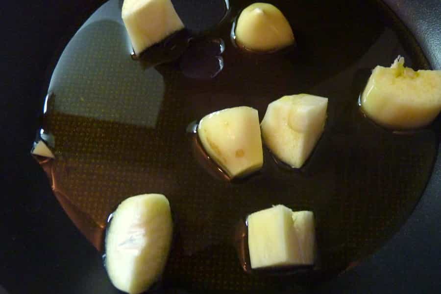 Lava y limpia el perejil, separando las hojas del tallo. Si quieres puedes dejar un poco de tallo, ya que se molerá, solo debes decidir si te gusta su sabor. Picar el ajo en trozos grandes, calentar el aceite de oliva en un sartén y sofreír el ajo por 1-2 minutos, hasta que comience a quedar dorado por fuera.