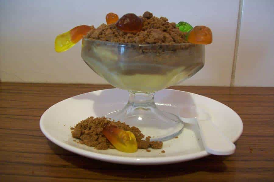 4. Ubica algunas gomitas con forma de gusano como si estuviesen saliendo de la “tierra”. ¡Y listo! Ya tienes un delicioso y terrorífico postre a la vez. Incluso, si te motivas a que esto quede con una mejor presentación puedes comprar pequeños maceteros plásticos y presentar ahí tu "podrido postre” ¡De miedo!