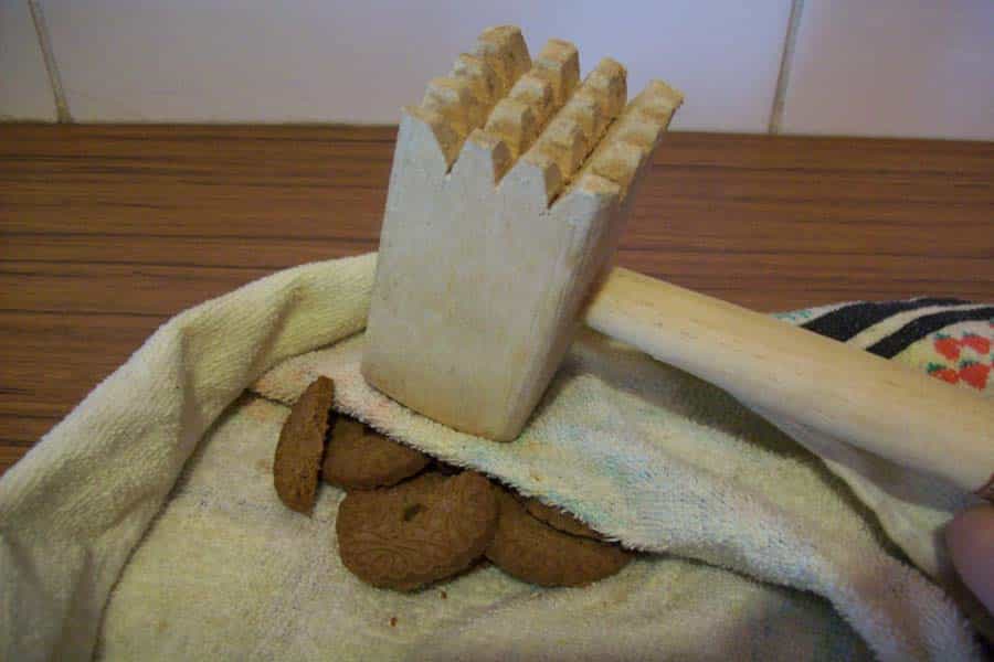 2. Muele las galletas de chocolate. Como son pocas galletas puedes ubicarlas dentro de un paño de cocina y pegarles con un martillo de madera de cocina procurando que los trozos no se desparramen.
