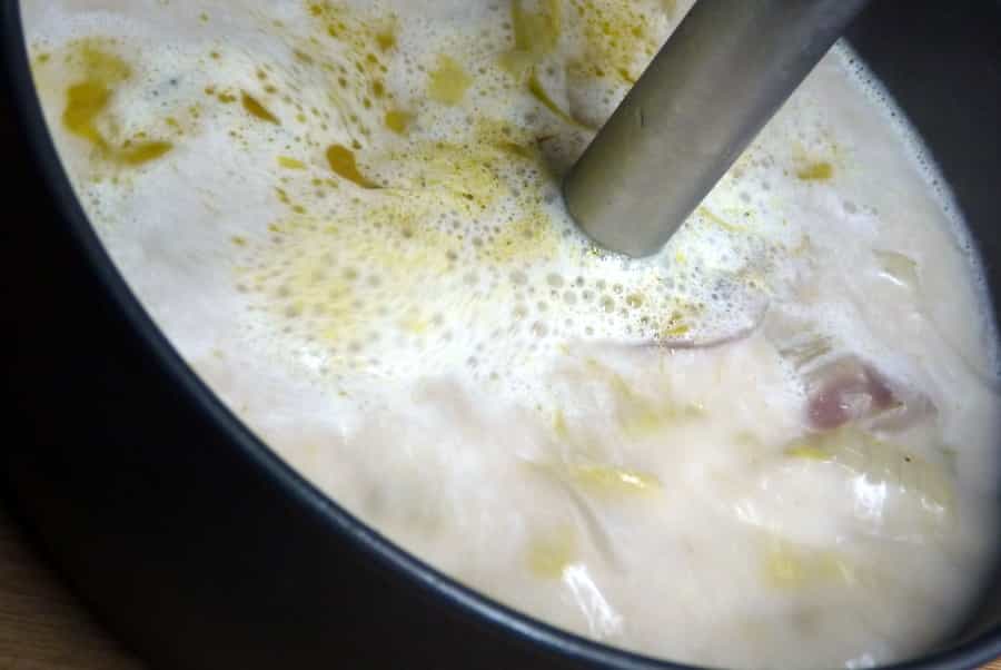 Agrega el queso roquefort a la sopa y mezcla bien. Luego con un procesador de alimentos muele los ingredientes. Agrega sal y pimienta gusto y sirve caliente.