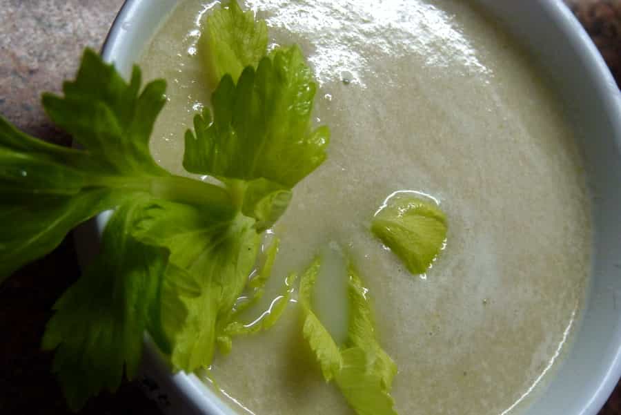 Limpia y corta la cebolla en juliana. En una olla a fuego lento derrite la margarina. Añade la cebolla y saltea por 10 minutos o hasta que quede transparente. Limpia el apio, cuidando sacar bien las fibras, y pícalo en trozos pequeños. Agrega el apio junto a las tazas de agua. Cubre la olla y lleva a hervor. Luego reduce la temperatura y deja cocer por 30 minutos o hasta que el apio esté suave. La proporción de agua en esta receta es para lograr una sopa cremosa, si la prefieres más líquida, puedes añadir más agua.