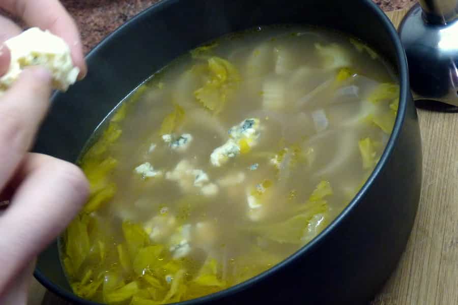 Normalmente no uso margarina, prefiriendo el aceite o la mantequilla. Pero en esta ocasión, el sabor de la margarina acompaña mejor al resto de los ingredientes. Si deseas, al servir puedes agregar un poco más de queso roquefort encima de la sopa. Con esta preparación seguro sorprenderás a tus comensales.