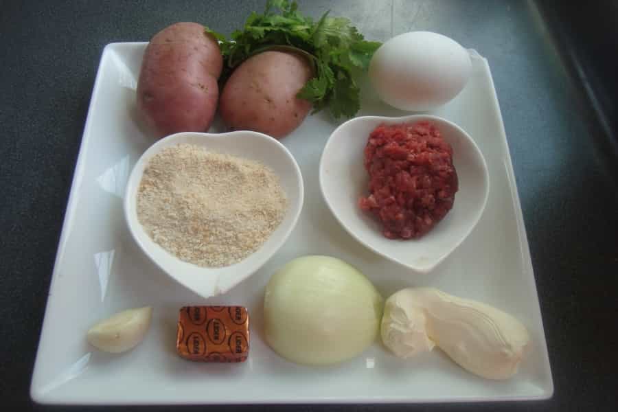 -400 gramos de carne molida -1 huevo -2 cucharadas de pan rallado -2 cucharadas de perejil picado -1 diente de ajo -½ kilo de papas -1 cucharadita de margarina -2 cucharadas de leche -½ cebolla -½ pimentón -1 cubo de caldo concentrado -Sal – Pimienta -Aceite de oliva Preparación Para preparar la salsa: cocinar a fuego medio 1/4 litro de agua, cebolla, pimentón, ajo y el cubo de caldo concentrado, dejar hervir por 5 minutos y apagar. Una vez que el caldo se ha enfriado, retirar el pimentón, la cebolla y el ajo, verter en una hielera, llevar al refrigerador hasta que este congelada.