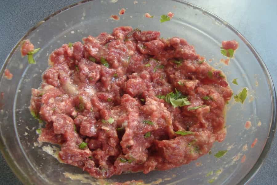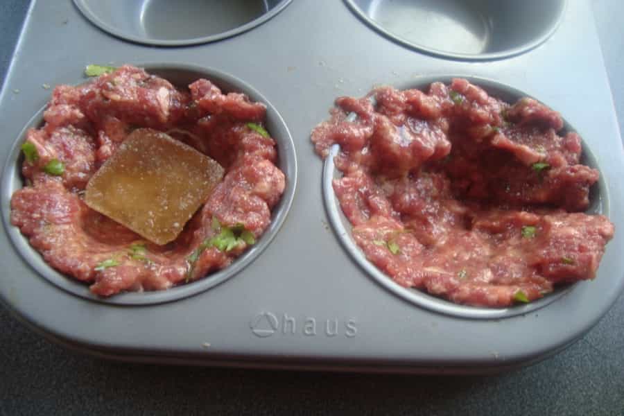 Trabajar con las manos hasta formar una pasta. En un molde para cupcakes, colocar un poco de la mezcla, ahuecar el centro, colocar un hielo de salsa congelada y tapar con otro poco de carne.
